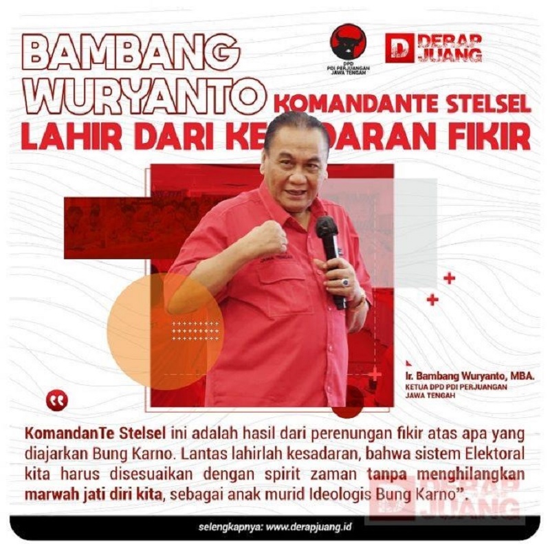 “KomandanTe Stelsel ini adalah hasil dari perenungan pikir atas apa yang diajarkan Bung Karno, lantas lahirlah kesadaran, bahwa sistem Elektoral kita harus disesuaikan dengan spirit zaman tanpa menghilangkan marwah jati diri kita sebagai anak Ideologis Bung Karno,” jelas politisi senior yang kerab disapa Bambang Patjul saat ditemui tim Derap Juang.