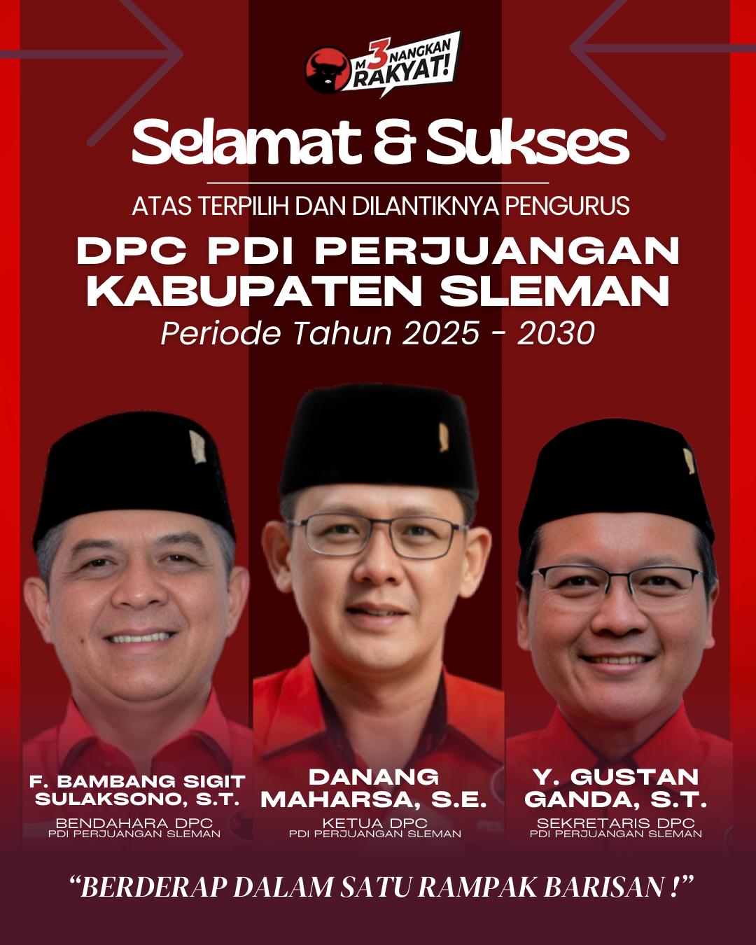 Jakarta, Gesuri.id - Kepengurusan Dewan Pimpinan Cabang (DPC) PDI Perjuangan Sleman resmi berganti. Danang Maharsa, diberi kepercayaan memimpin Partai Banteng Bumi Sembada.