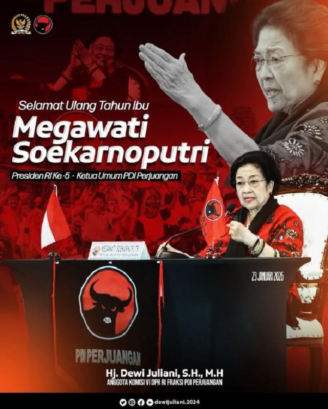 Jakarta, Gesuri.id - Anggota Komisi VI DPR RI Fraksi PDI Perjuangan, Dewi Juliani, mengucapkan Selamat ulang tahun kepada Ibu Megawati Soekarnoputri, Presiden ke-5 Republik Indonesia dan Ketua Umum PDI Perjuangan.