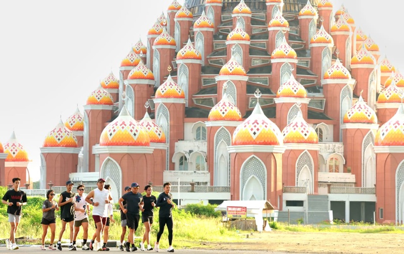 Saat melewati Masjid 99 Kubah, Hasto mengajak pelari untuk berhenti sejenak, memandang arsitek masjid yang indah itu. Dia pun mengajak para pelari untuk berpose sejenak.