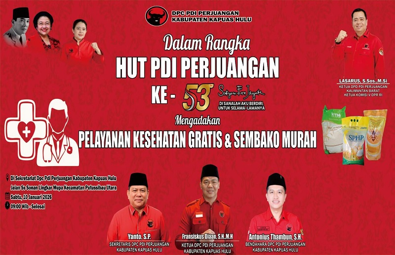 Kapuas Hulu, Gesuri.id - Ketua DPC PDI Perjuangan sekaligus Bupati Kapuas Hulu, Fransiskus Diaan, memberikan pernyataan resmi dalam rangka memperingati Hari Ulang Tahun (HUT) PDI Perjuangan ke-53 (10 Januari 1973 – 10 Januari 2026). Peringatan tahun ini menjadi momentum krusial bagi partai untuk memperkuat akar ideologi dan komitmen kerakyatan melalui pelaksanaan Rapat Kerja Nasional (Rakernas) 1 Tahun 2026.