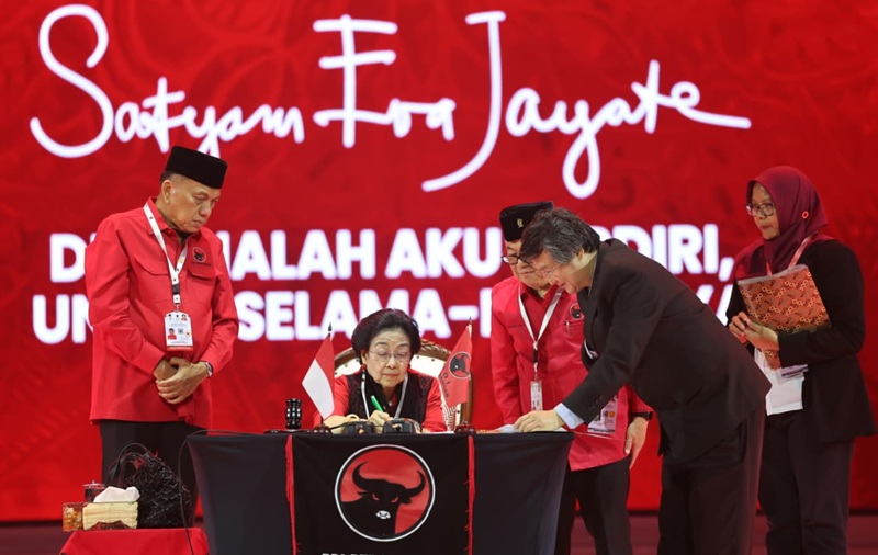 Penandatanganan dilakukan langsung oleh Ketua Umum PDIP, Prof. Dr. (H.C.) Megawati Soekarnoputri, disaksikan Ketua DPP PDIP Darmadi Durianto dan Bendahara Umum PDIP Olly Dondokambey.