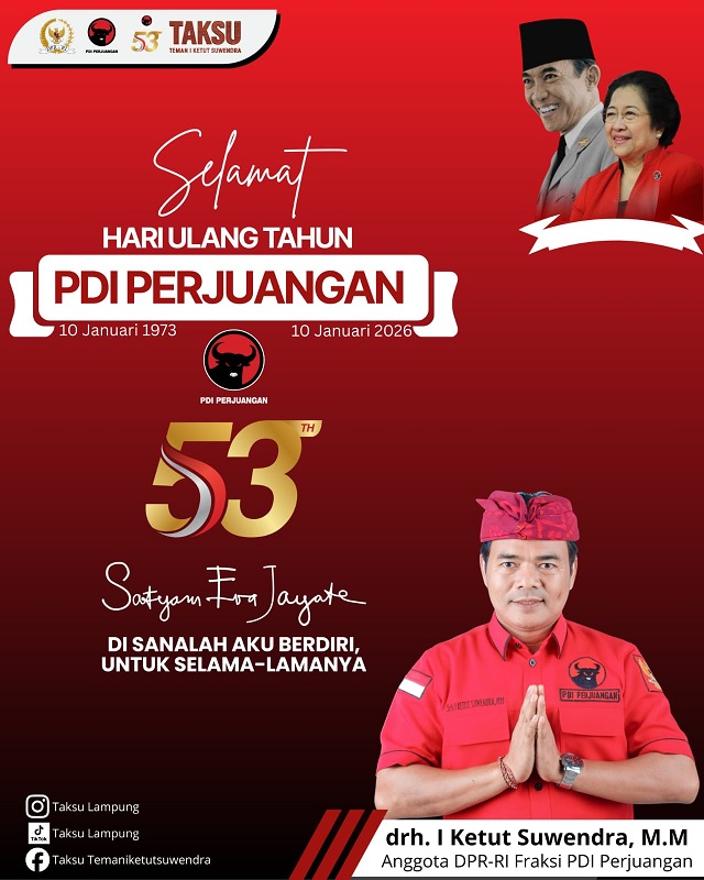 Anggota Komisi IV DPR Fraksi PDI Perjuangan, Drh. I Ketut Suwendra, MM menyampaikan ucapan selamat Hari Ulang Tahun (HUT) ke-53 PDI Perjuangan Tahun 2026.