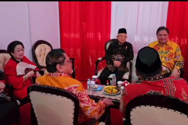 Wakil Presiden Ma’ruf Amin juga turut hadir setelah para menterinya hadir. Sang Wapres juga terlihat berbincang bersama Megawati dengan para tokoh lainnya, termasuk Ketua DPR Puan Maharani.