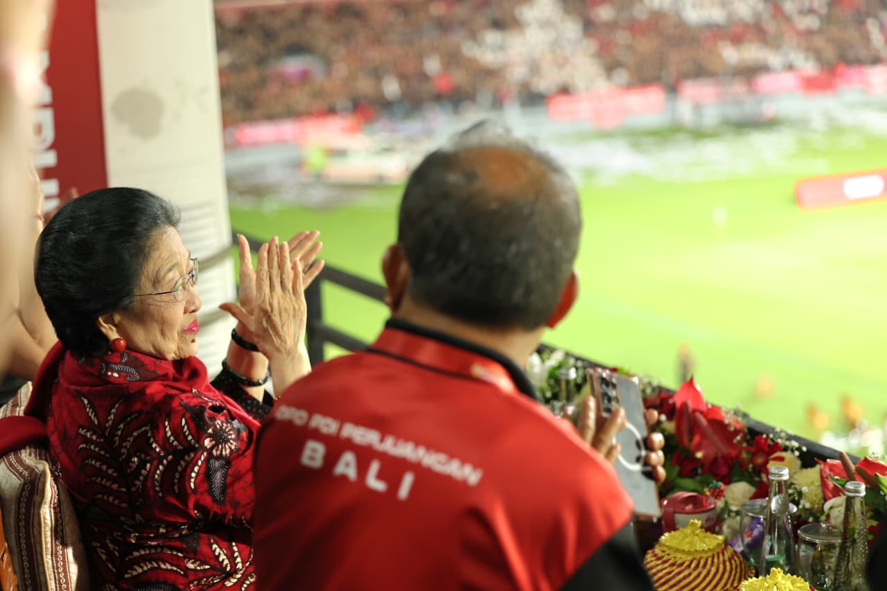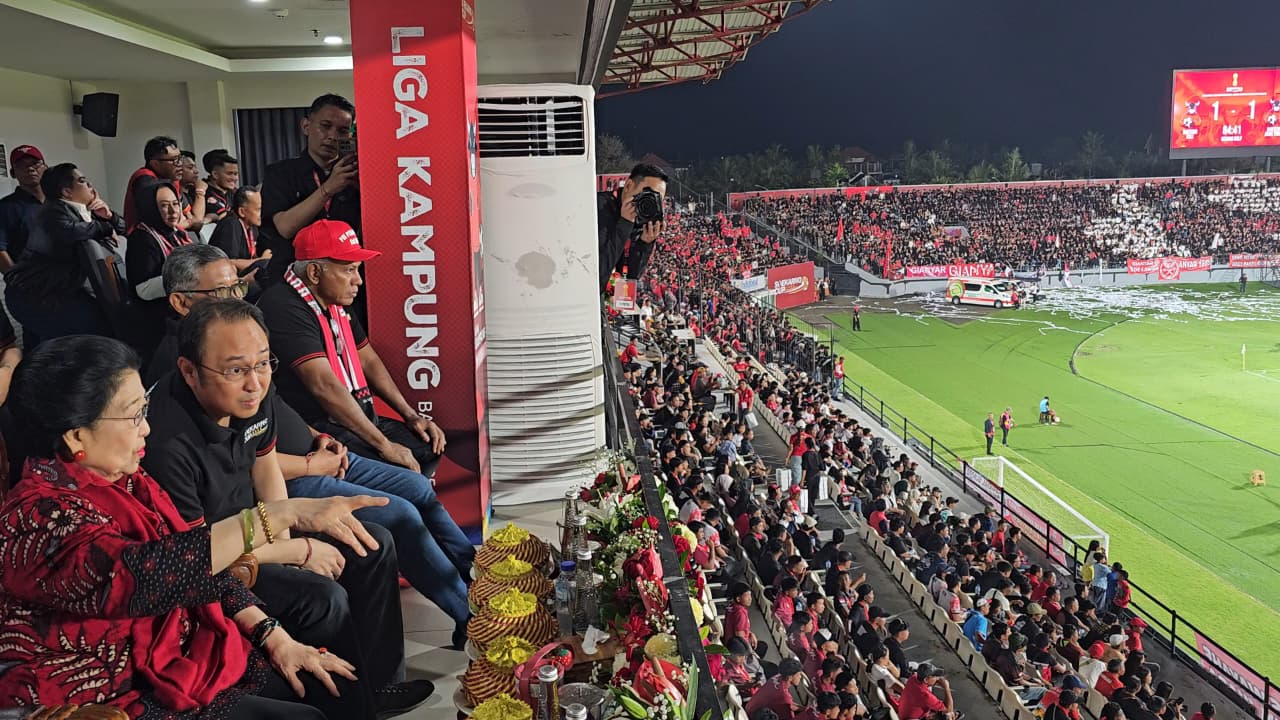 Sesekali Megawati berbincang dengan Prananda dan Koster yang mengapit dirinya. Megawati pun tak kuasa menahan diri bertepuk tangan dan tersenyum lebar saat gol terjadi. Termasuk saat kemelut terjadi di mulut gawang. Seperti ribuan penonton, Megawati pun menanti apakah bola masuk gawang atau tidak.