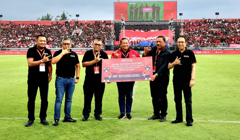 Gianyar, Gesuri.id - PDI Perjuangan menyerahkan secara simbolis donasi hasil penjualan merchandise Soekarno Cup 2025 dan sumbangan suporter kepada korban bencana banjir Aceh, Sumatera Utara dan Sumatera Barat di sela laga final Liga Kampung Soekarno Cup 2025 di Stadion Kapten I Wayan Dipta, Gianyar, Sabtu, (13/12/2025).