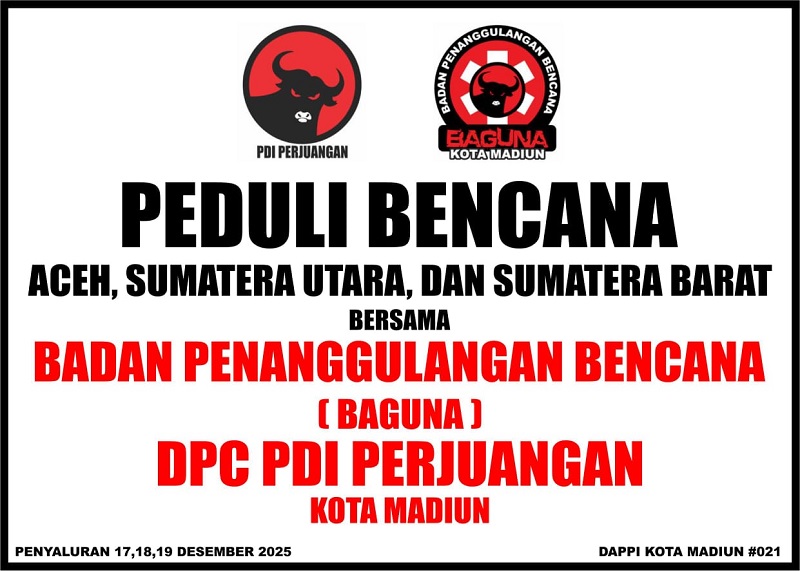 Kota Madiun, Gesuri.id - Badan Penanggulangan Bencana (BAGUNA) DPC PDI Perjuangan Kota Madiun menerima bantuan kemanusiaan yang dikomandoi oleh Oki Sesar Crisandy, selaku Kepala BAGUNA.