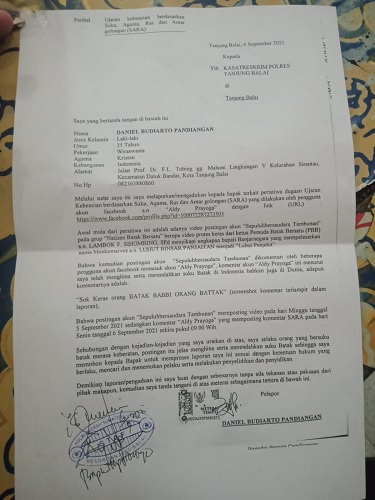 “Kami, pada hari Senin tanggal 6 September 2021 telah melaporkan akun facebook atas nama Aldy Prayoga atas komentarnya terhadap vidio di facebook yang diunggah oleh “Sepuluhbersaudara Tambunan” yang diposting di grup facebook “Natizen Batak Bersatu”. Dalam komentarnya itu, dia bilang suku Batak “Sok Keras orang BA7AK BABxx ORANG BATTAK” dan juga mengatakan, “Siap Berperang”.