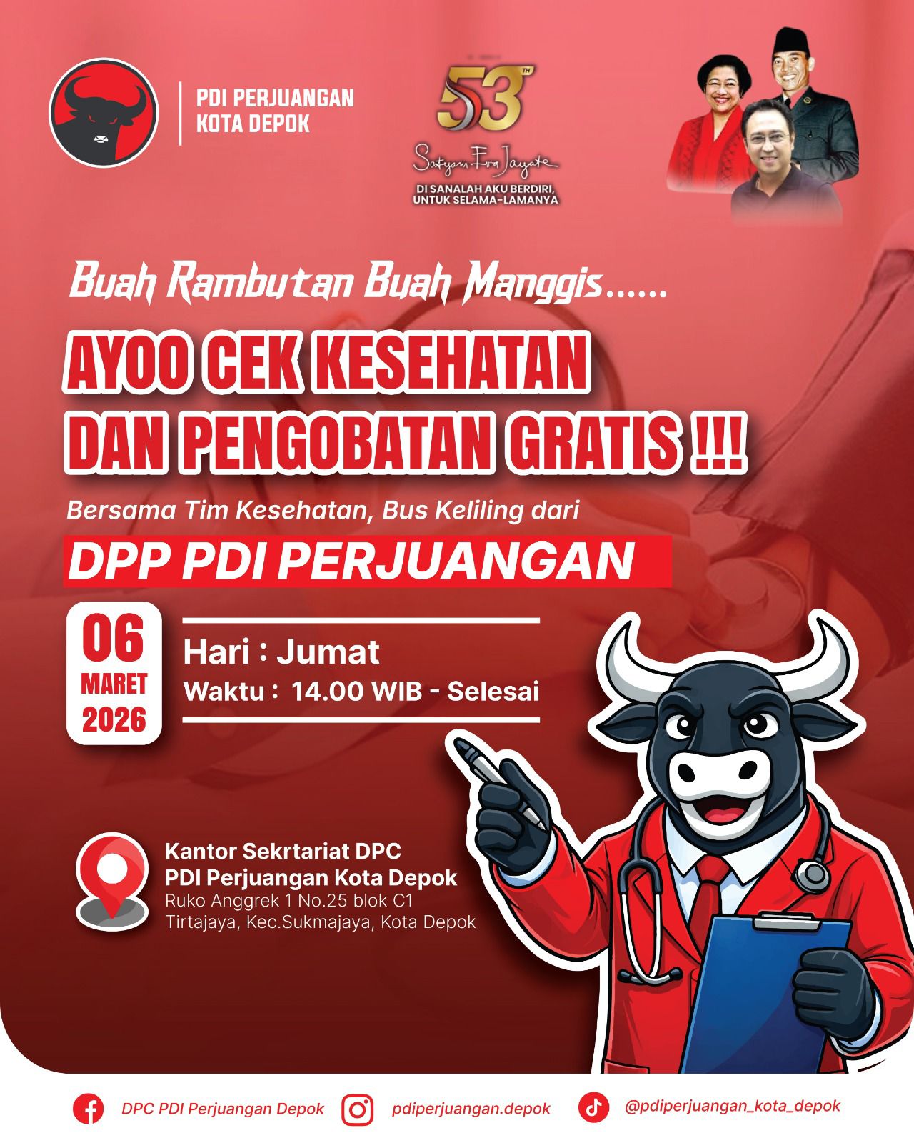 “Langkah ini diambil sebagai bentuk komitmen partai dalam menyentuh aspek paling mendasar dari kehidupan warga, yakni kesehatan,” ujar Imam Turidi di kawasan Margonda, Kota Depok, Kamis (5/3).