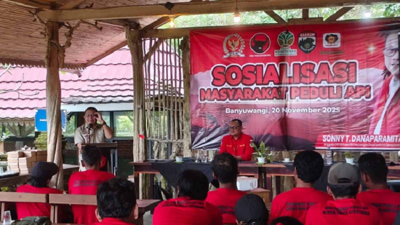 Ia menyampaikan hal itu dalam Sosialisasi Masyarakat Peduli Api (MPA) yang digelar bersama KLHK, Gakkum Kehutanan, dan Manggala Agni di kawasan wisata Gumuk Candi, Songgon, Kamis (20/11/2025).