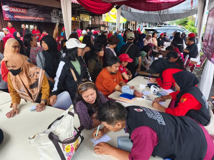 Jakarta, Gesuri.id - Ratusan warga antusias mengikuti cek kesehatan dan pengobatan gratis yang digelar DPC PDI Perjuangan Depok sekretariat mereka di Ruko Anggrek, Jalan Boulevard Grand Depok City (GDC), Kelurahan Tirtajaya, Kecamatan Sukmajaya, Kota Depok pada Jumat (6/3).