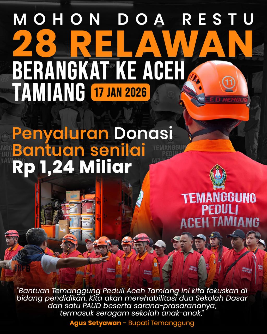 Dalam misi ini, sebanyak 28 personel dari lintas organisasi relawan diterjunkan. Mereka dijadwalkan menjalankan misi "Temanggung Peduli Aceh Tamiang" selama dua pekan, mulai 21 hingga 28 Januari mendatang. Bupati yang akrab disapa Agus Gondrong ini juga berharap kepada para relawan agar menuntaskan pekerjaan mereka dengan maksimal.