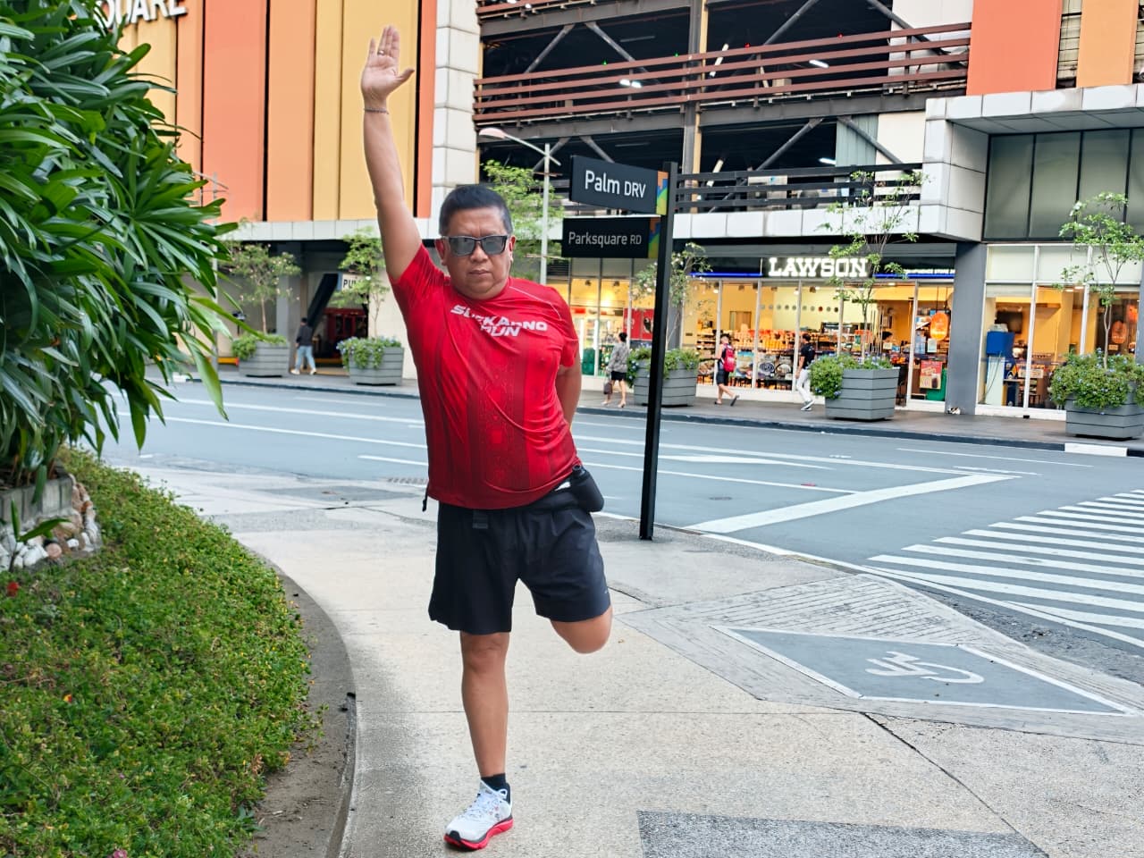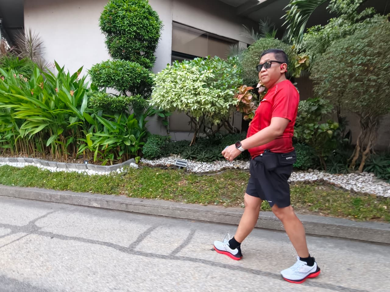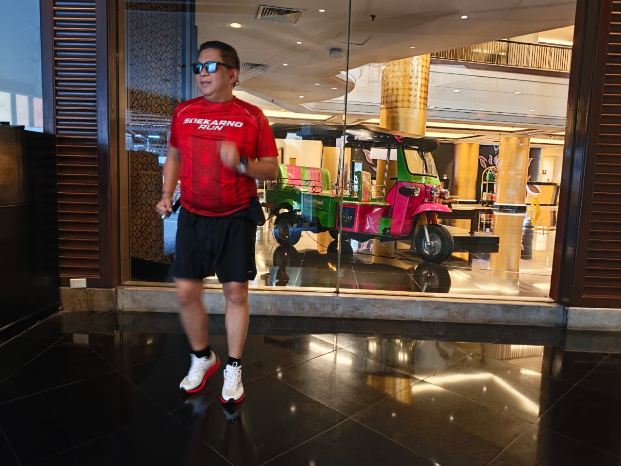 Sebelum memacu langkahnya, Hasto melakukan gerakan pemanasan (stretching) yang matang di area lobi hotel, memastikan otot-ototnya siap menghadapi rute aspal Makati menuju arah Ayala Triangle Gardens.
