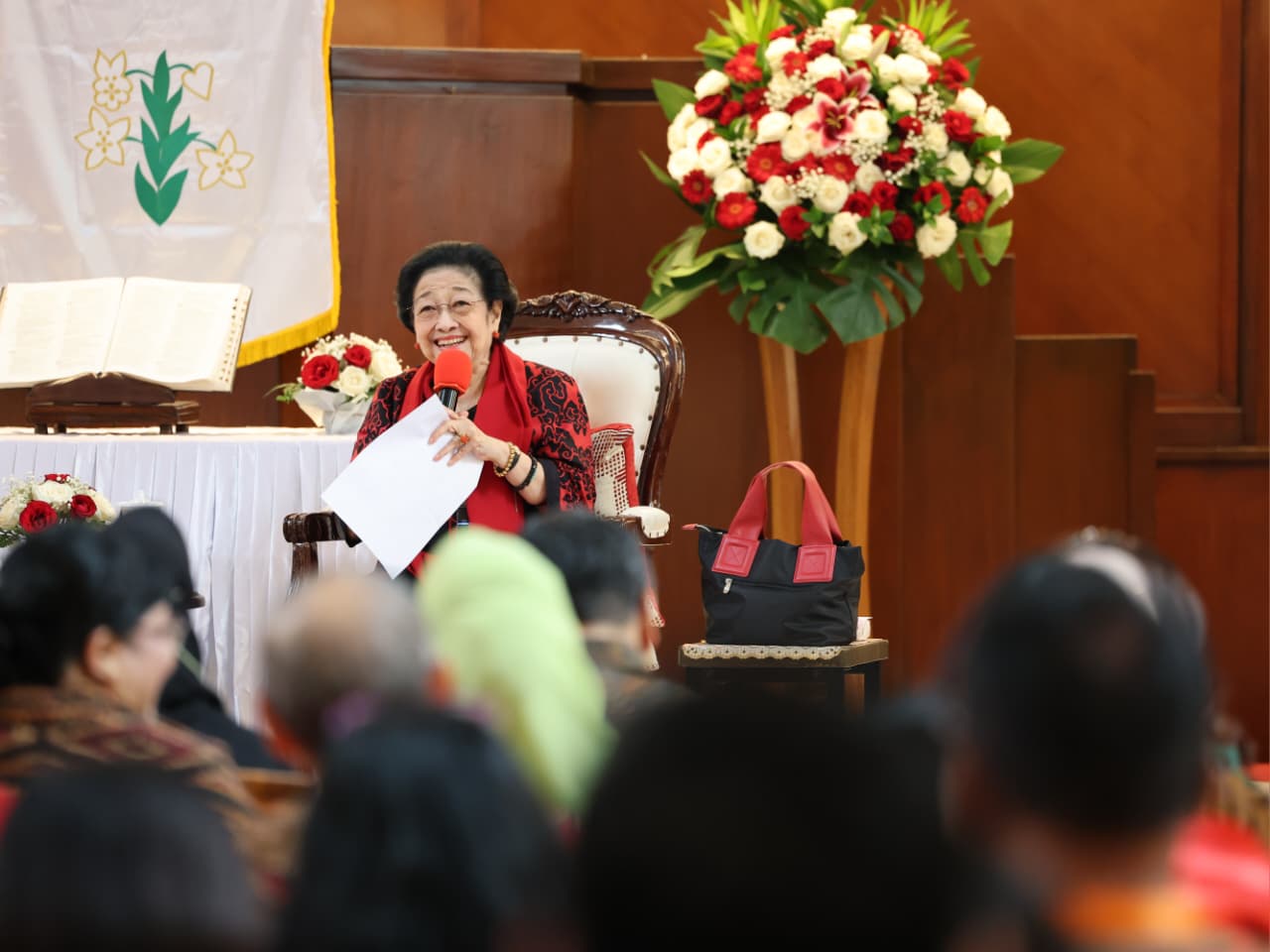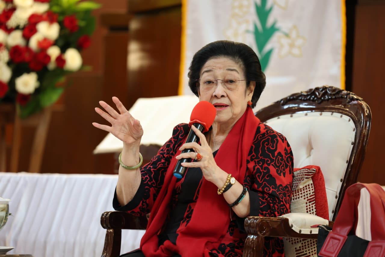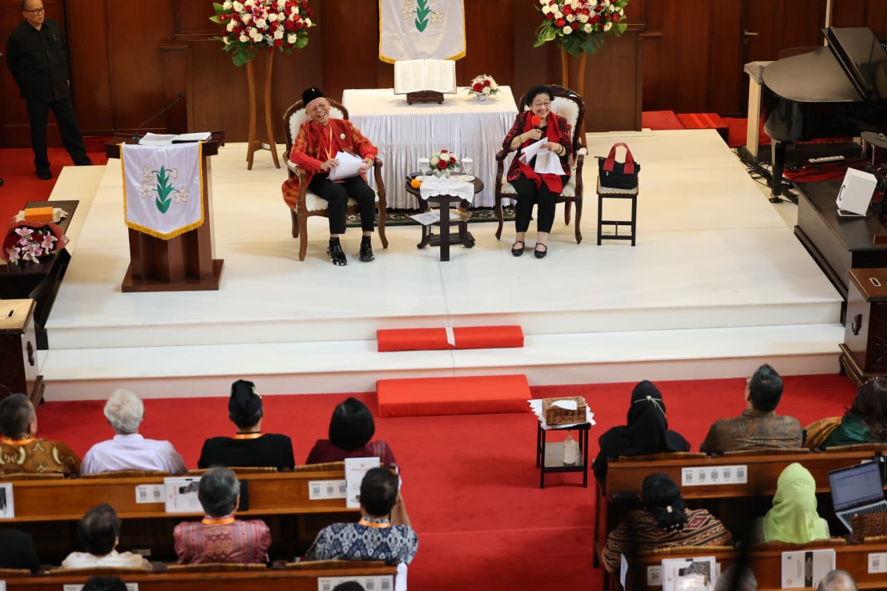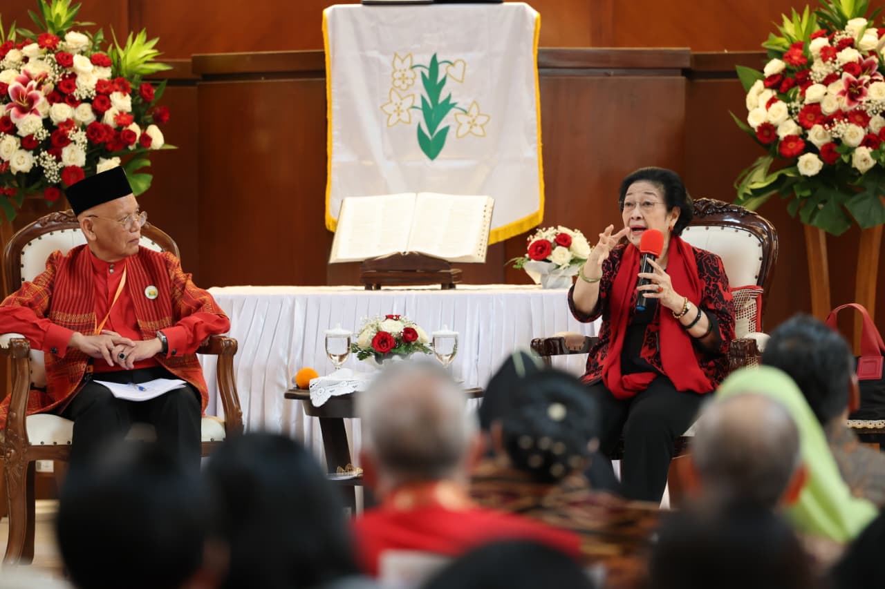 Jakarta, Gesuri.id - Presiden Ke-5 Republik Indonesia yang juga Ketua Umum PDI Perjuangan Megawati Soekarnoputri bicara tentang Pancasila, Kebangsaan, Keragaman dan Globalisasi saat menjadi pembicara di talkshow Pelayanan Kategorial Persekutuan Kaum Lanjut Usia (Pelkat PKLU) di GPIB Paulus, Menteng, Jakarta Pusat, Selasa (21/4/2026).