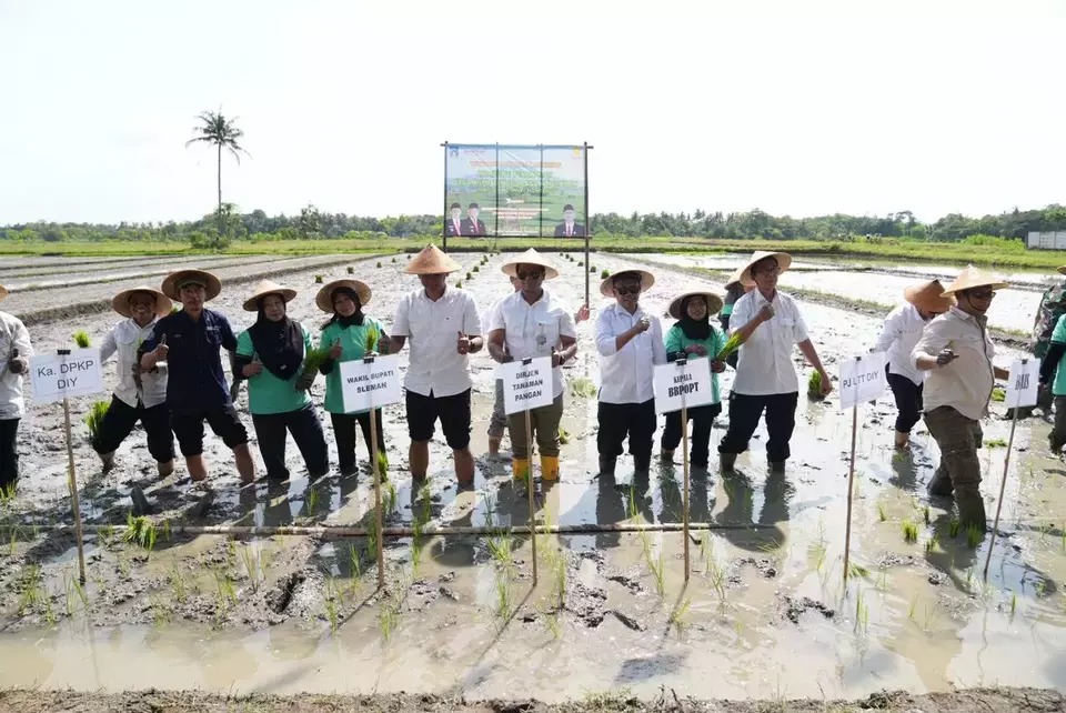 Peluncuran kampung peramalan OPT diawali dengan penanaman padi dan pemotongan tumpeng oleh jajaran Direktorat Jenderal Tanaman Pangan bersama Wakil Bupati Sleman Danang Maharsa.