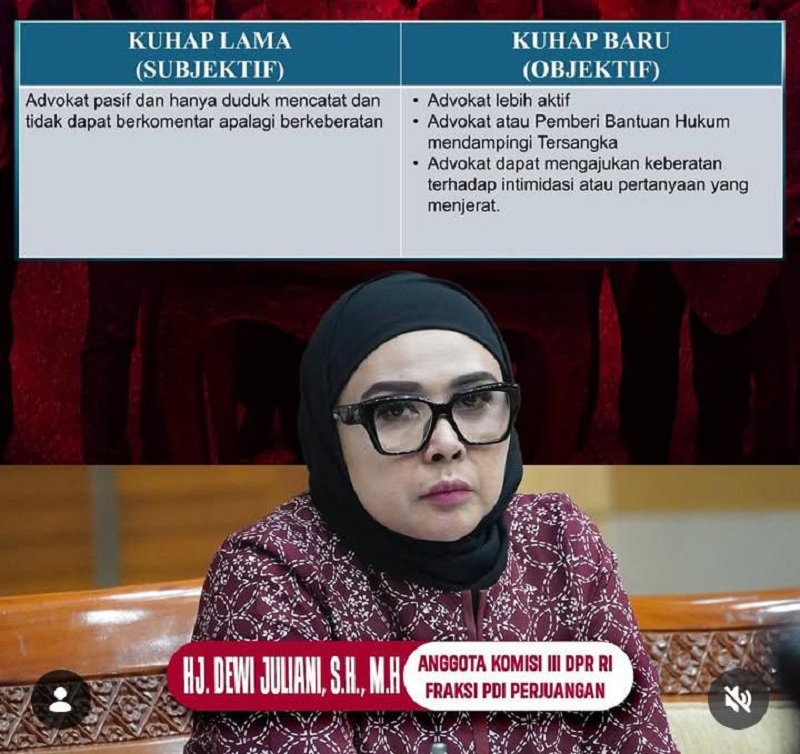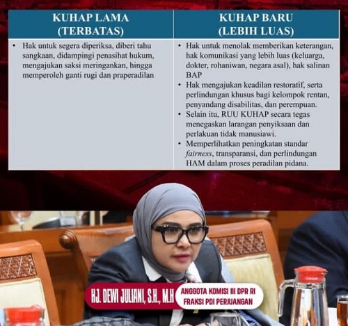 Jakarta, Gesuri.id - Anggota Komisi III DPR RI Fraksi PDI Perjuangan, Dewi Juliani, mengatakan KUHAP Baru menghadirkan penguatan signifikan terhadap mekanisme pemulihan korban tindak pidana melalui pengaturan yang lebih komprehensif dan berkeadilan.
