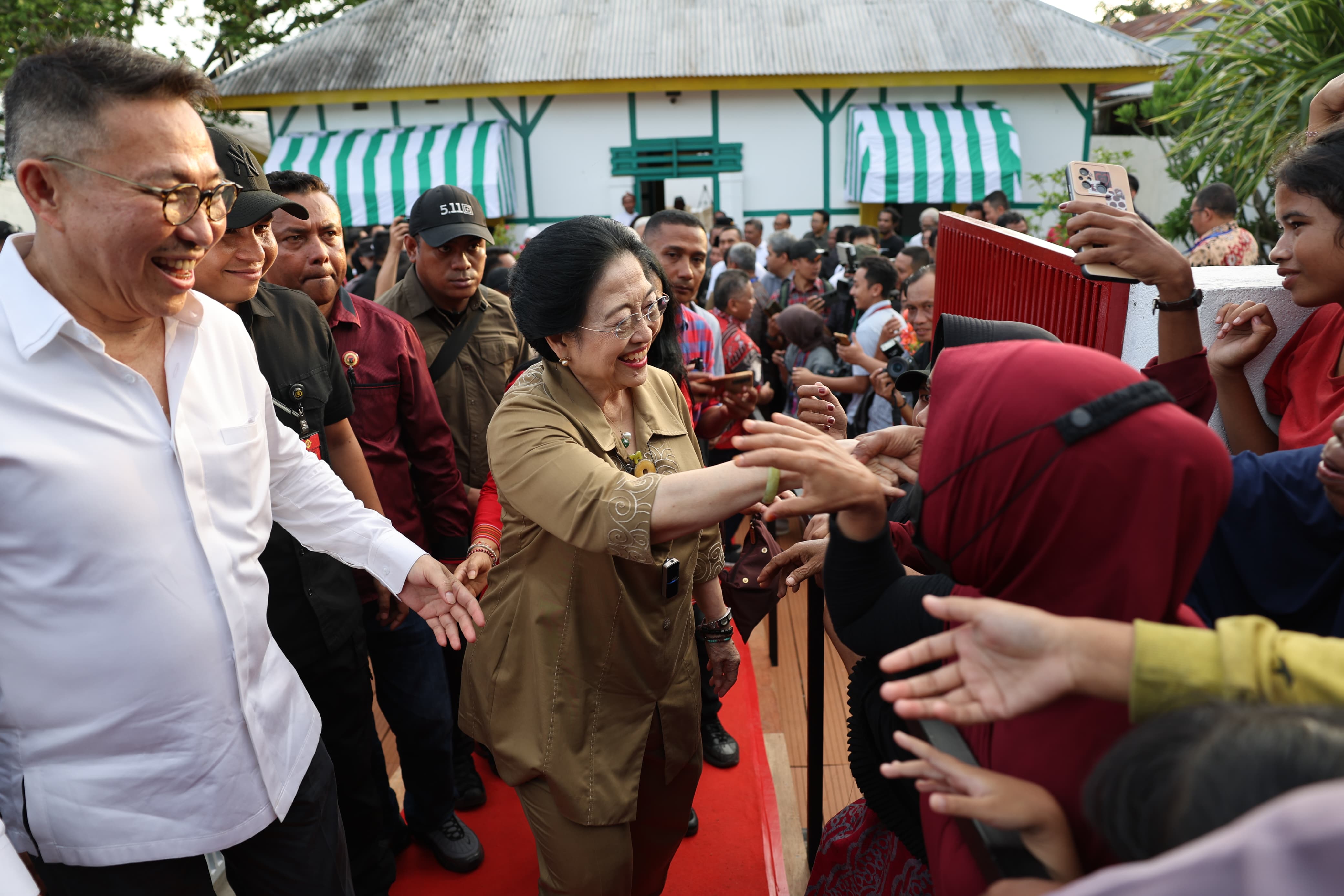 Rupanya, ribuan masyarakat sekitar telah menunggu Megawati keluar dari Rumah Pengasingan itu. Para bapak, ibu dan anak-anak pun histeris dan berebut untuk bersalaman hingga berfoto dengan Megawati.