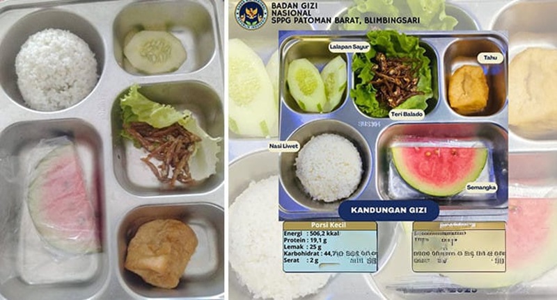 Diketahui sebelumnya, menu MBG yang dibagikan berisi nasi, ikan teri goreng dengan porsi kecil, daun selada satu lembar, sepotong tahu, sepotong mentimun, dan buah semangka.