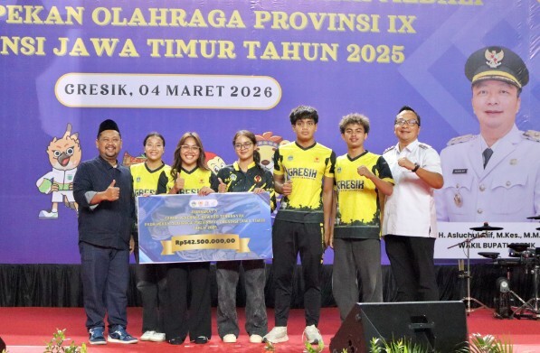 Jakarta, Gesuri.id - Bupati Gresik Fandi Akhmad Yani menyerahkan bonus dan penghargaan kepada para atlet, pelatih, asisten pelatih serta official berprestasi pada ajang Pekan Olahraga Provinsi (Porprov) IX Jawa Timur tahun 2025.