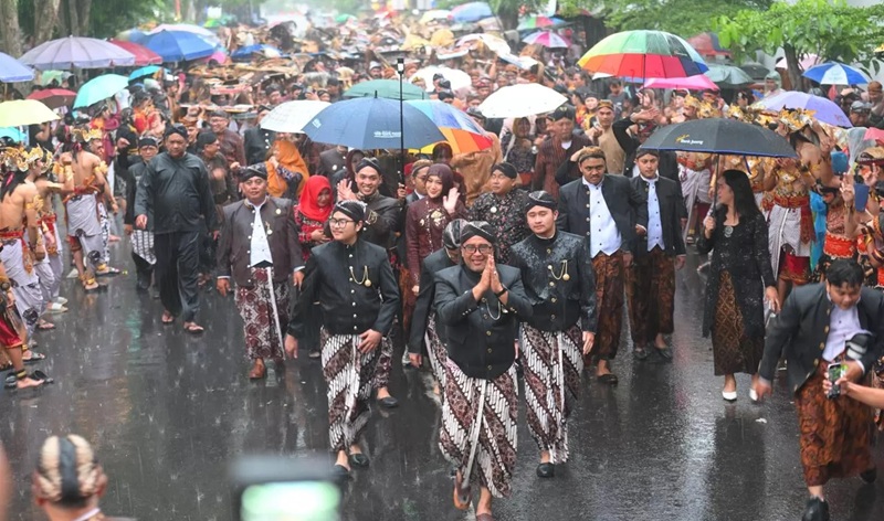 Bukannya berteduh, Bupati Agus justru tetap melanjutkan prosesi sakral tersebut bersama para penari jaran kepang, topeng ireng, hingga soreng, kendati pakaian yang dikenakan basah kuyup.