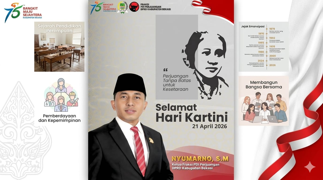 Bekasi, Gesuri.id – Ketua Fraksi PDI Perjuangan DPRD Kabupaten Bekasi Nyumarno, S.M., menegaskan peringatan Hari Kartini 2026 harus menjadi momentum memperkuat perjuangan perempuan Indonesia, khususnya di Kabupaten Bekasi, untuk mewujudkan Trisakti Bung Karno: berdaulat di bidang politik, berdikari di bidang ekonomi, dan berkepribadian dalam kebudayaan.