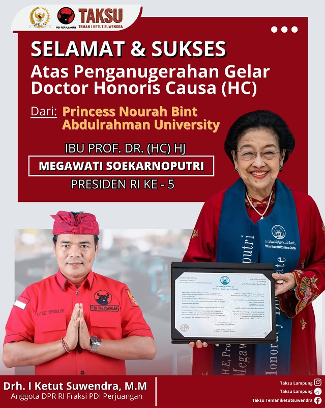 "Saya, I Ketut Suwendra Anggota DPR Fraksi PDI Perjuangan mengucapkan selamat kepada Ketua Umum kami, Ibu Megawati Soekarnoputri atas penganugerahan gelar Doktor Honoris Causa dari Princess Nourah University. Semoga ini menjadi inspirasi bagi perempuan untuk membangun emansipasi. Dimana perempuan memiliki hak dan kewajiban yang sama di mata hukum dan pemerintahan," ujar I Ketut Suwendra, Selasa (10/2/2026 ).