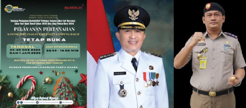 Jakarta, Gesuri.id - Kantor Wilayah Badan Pertanahan Nasional (BPN) Lampung Barat menginformasikan pelayanan pertanahan bagi masyarakat sepanjang masa libur Natal 2025 dan Tahun Baru 2026 tetap dibuka, Sabtu (27/12).