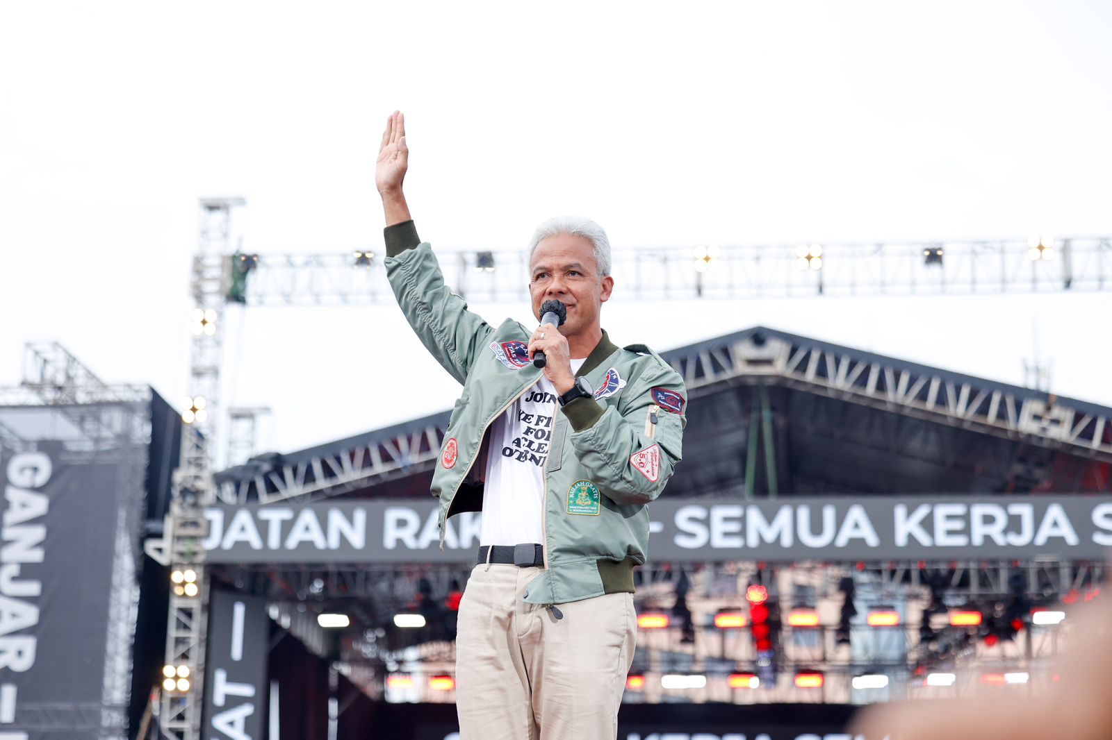 Dalam kampanye akbar bertajuk Hajatan Akbar di Semarang, Jateng, Sabtu (10/2), Ganjar membawa Raihan Muzadi, alumni SMKN Jateng yang kini telah bekerja sebagai karyawan di salah satu perusahaan di Semarang.