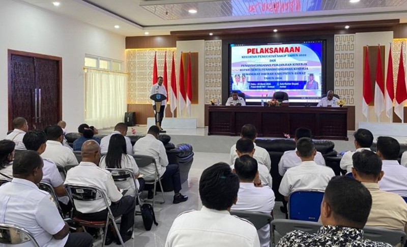 Asmat, Gesuri.id - Pemerintah Kabupaten (Pemkab) Asmat melalui Bagian Organisasi Sekretariat Daerah menggelar kegiatan pelaksanaan penguatan Sistem Akuntabilitas Kinerja Instansi Pemerintah (SAKIP) tahun 2026, sekaligus penandatanganan perjanjian kinerja Bupati serta penandatanganan kinerja perangkat daerah Kabupaten Asmat tahun 2026.