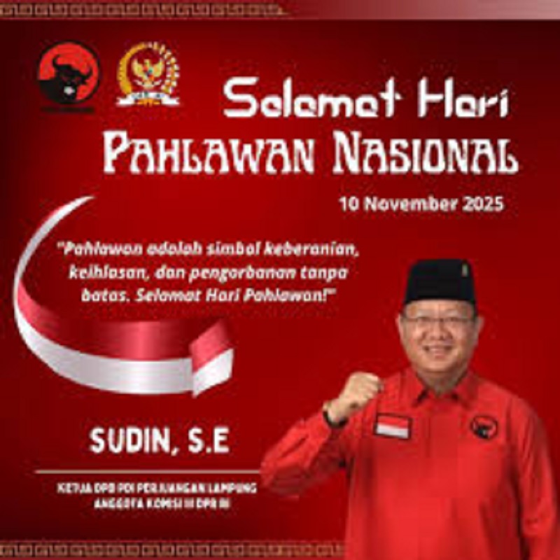 Jakarta, Gesuri.id - Anggota Komisi III DPR RI yang juga Ketua DPD PDI Perjuangan Provinsi Lampung, Sudin, menyampaikan ucapan selamat memperingati Hari Pahlawan Nasional tahun 2025.