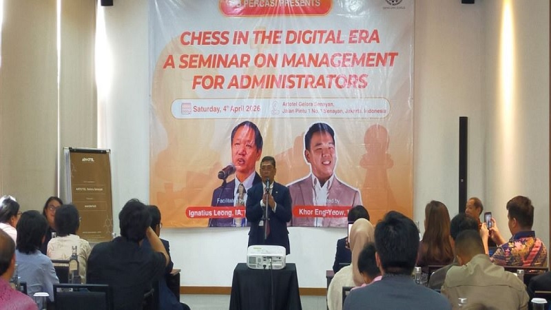 PB Percasi menggelar seminar membahas digitalisasi di catur bertajuk "Chess In The Digital Era A Seminar on Management for Administrators" di Artotel Hotel Senayan Jakarta, Sabtu (4/4/2026). Seminar yang diikuti 52 peserta termasuk Women Grand Master (WGM) WGM Enkhtuul Borjigon Altan-Uzli dari Mongolia menghadirkan dua pembicara dari Singapura yakni FST Ignatius Leong dan IA Khor Eng-Yeow.