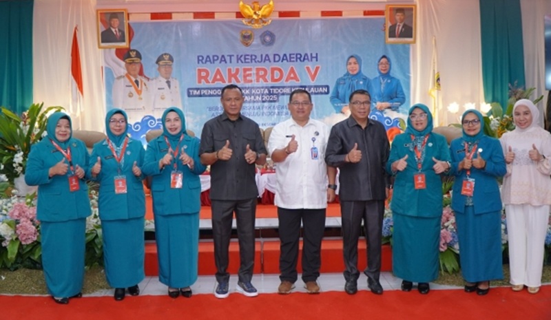 Rapat Kerja Daerah ke V TP PKK Kota Tidore Kepulauan yang mengusung tema “Bergerak Bersama PKK Mewujudkan Asta Cita Menuju Indonesia Emas” ini digelar di Aula Sultan Nuku Kantor Wali Kota Tidore, Selasa (2/12/2025).