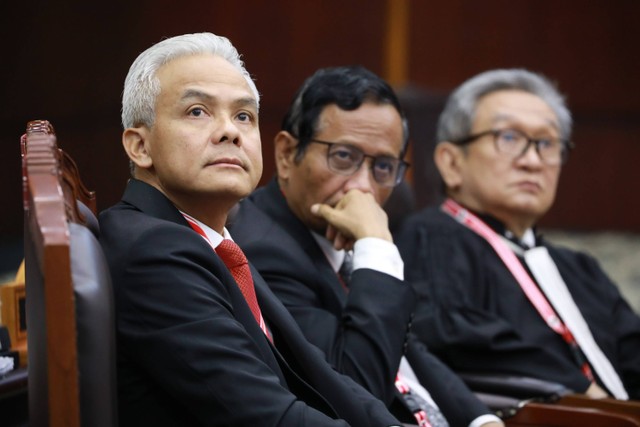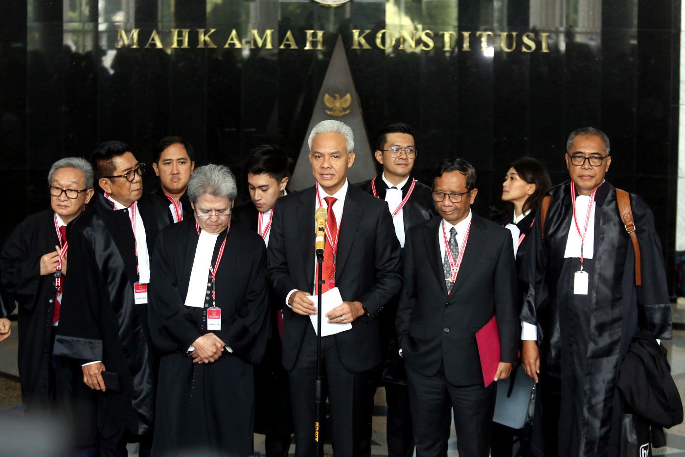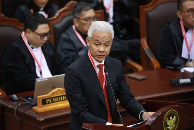 Jakarta, Gesuri.id - Calon Presiden (Capres) nomor urut 03, Ganjar Pranowo menyampaikan pidato dalam sidang Perselisihan Hasil Pemilihan Umum (PHPU) di depan delapan para hakim konstitusi di Mahkamah Konstitusi (MK), Jakarta Pusat, Rabu (27/3/2024).