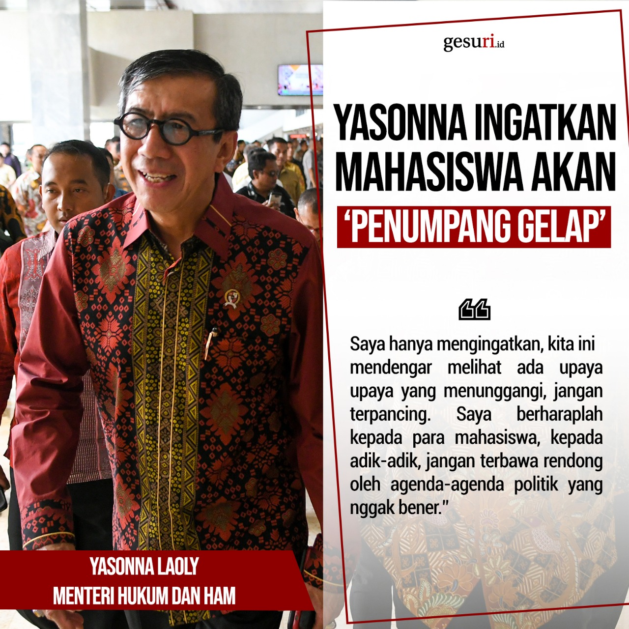 "Saya hanya mengingatkan, kita ini mendengar melihat ada upaya upaya yang menunggangi, jangan terpancing. Saya berharaplah kepada para mahasiswa, kepada adik-adik, jangan terbawa rendong oleh agenda-agenda politik yang nggak bener."