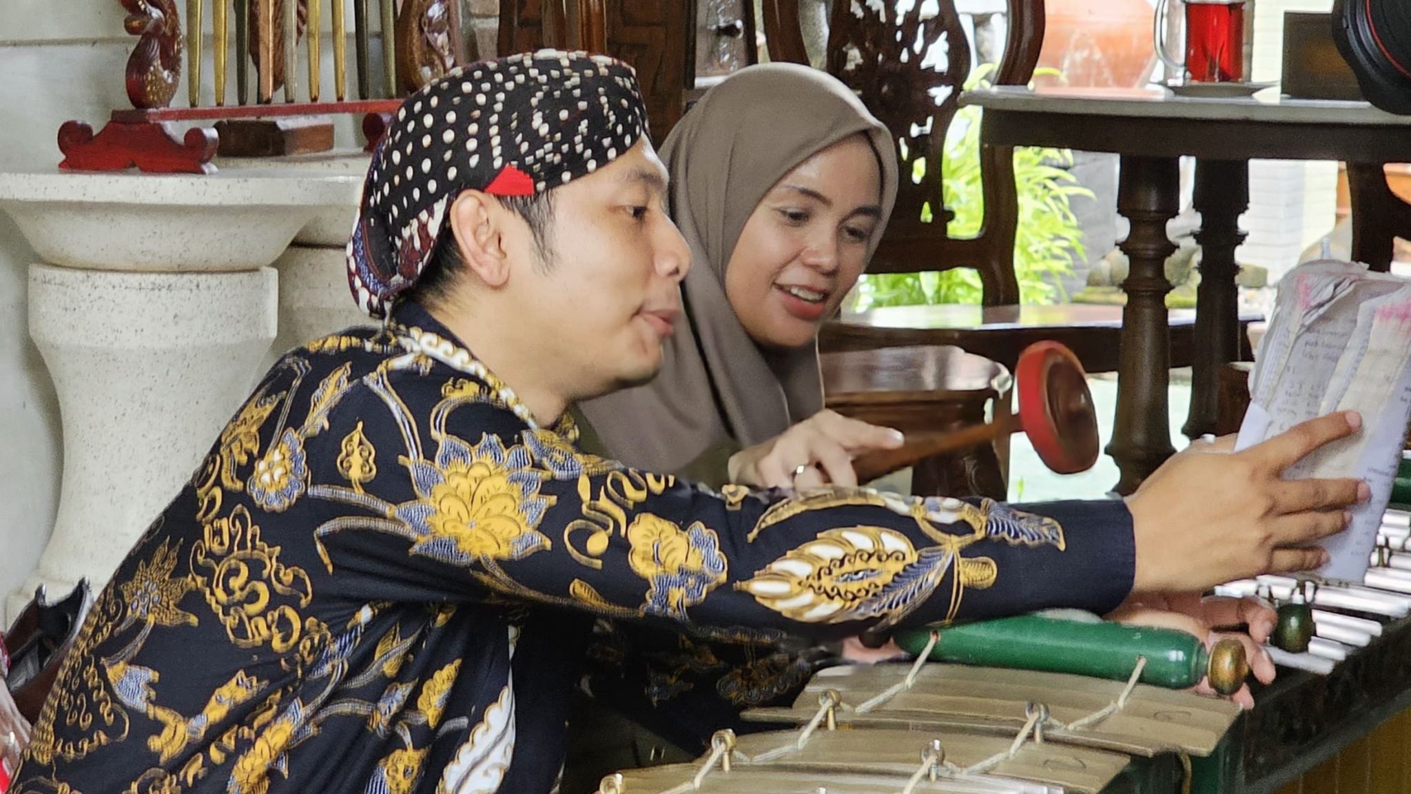 "Ya, aku diajari, ya, mas," kata dia saat ingin mencoba Slenthem.