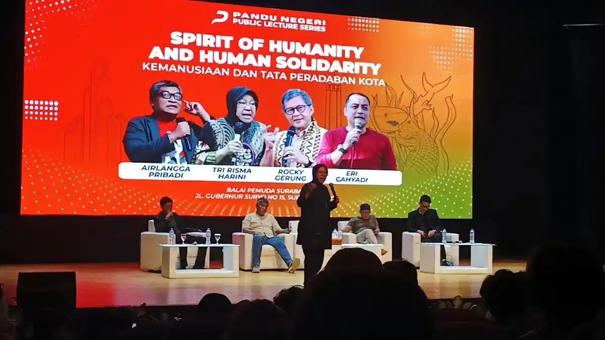 Forum ini mengangkat tema Kemanusiaan dan Tata Peradaban Kota bersama para pemateri Airlangga Pribadi, Tri Rismaharini Rocky Gerung, dan Walikota Eri Cahyadi
